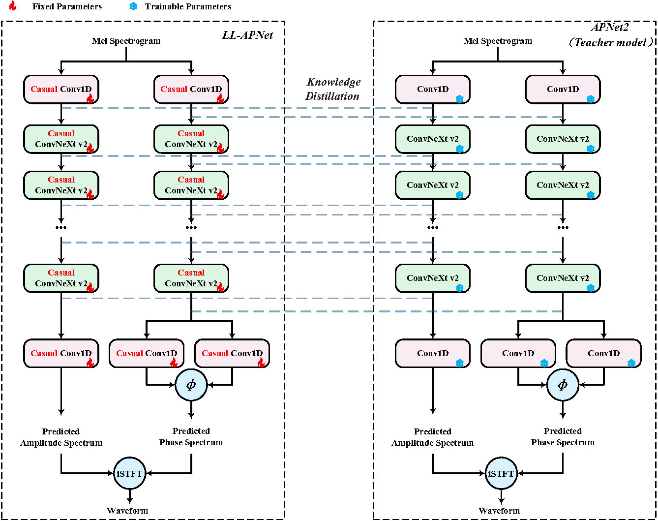 Fig.1 Model structure and knowledge distillation strategy of the proposed DLL-APNet vocoder.